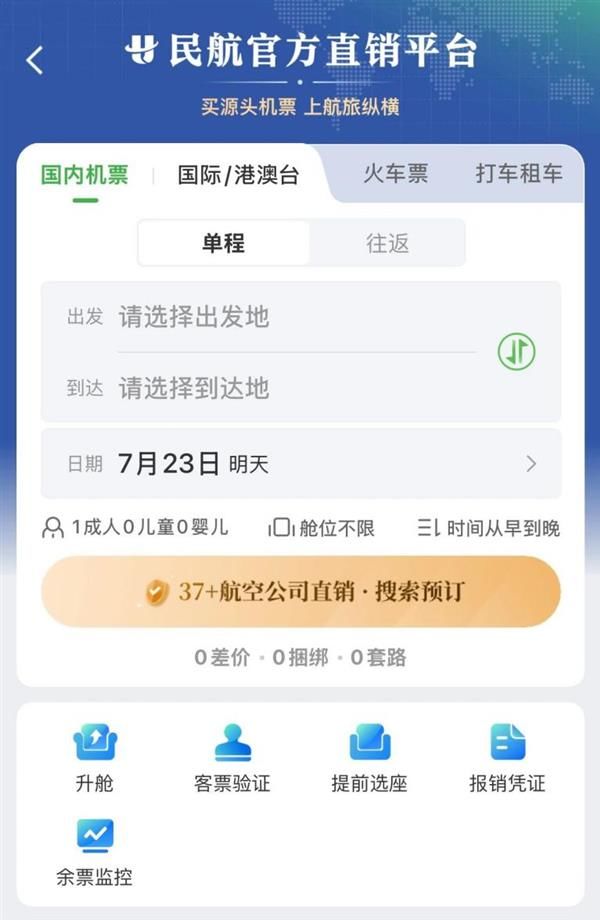 买机票总怕被加价、被捆绑销售?航旅纵横App上线的“民航官方直销平台”,直接整合了37家国内航空公司的直销机票资源,可实现“一站式”比价购票,0差价、0捆绑、0套路,购票0踩坑!购票安心,出行更踏实!